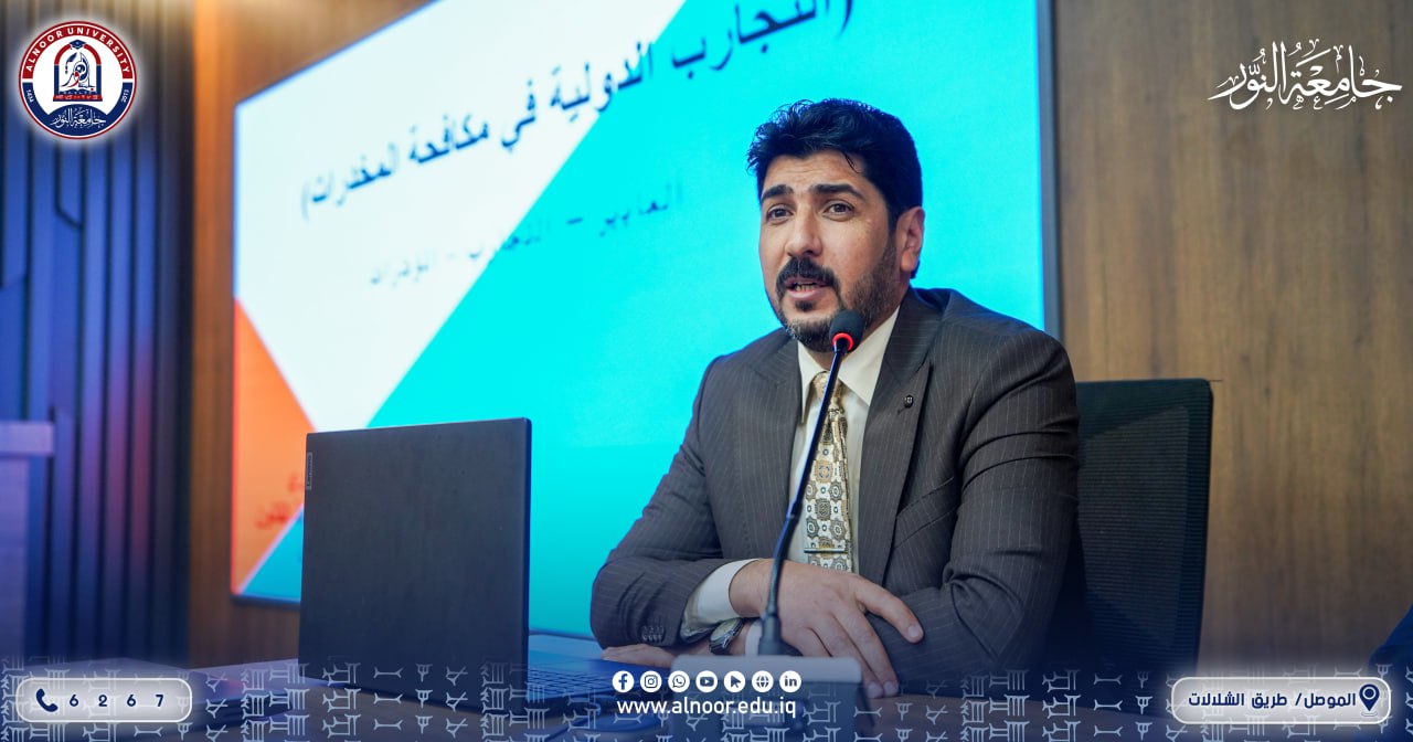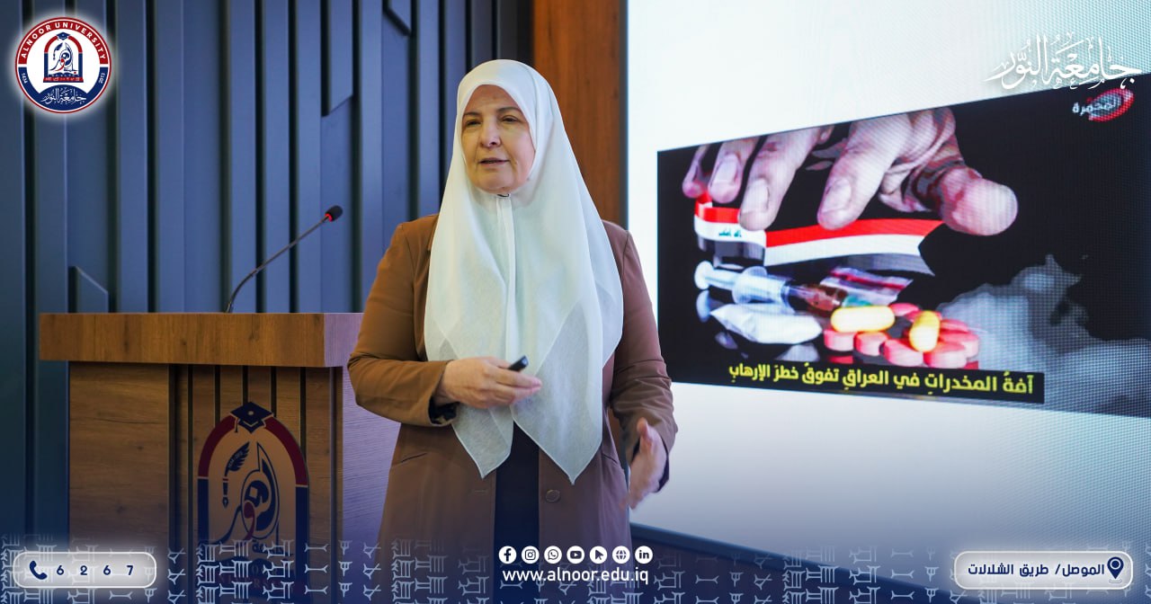 The opening session was attended by Professor Dr. Ismail Abdel Wahab, Scientific Assistant to the University President, in addition to the deans of the Colleges of Education, Law, Political Science, and Administrative Technologies, as well as the University's Scientific Advisor The activities of the Anti-Drug Week will continue for five days until Thursday, 20/11/2025, with the participation of 27 researchers from Alnoor University, universities in Nineveh Governorate, and relevant departments, during which 13 lectures will be delivered and 7 educational workshops will be held, in addition to an awareness poster exhibition.